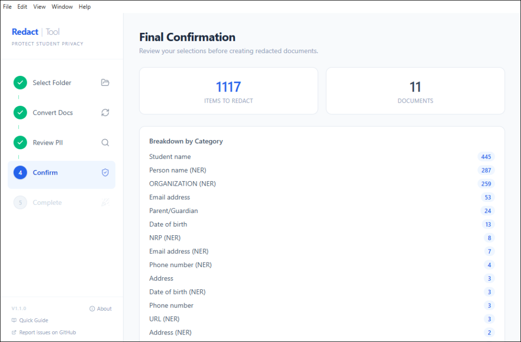 The Bulk Redaction Tool automates this process. You point it at a folder of documents, tell it the student’s name, and it: